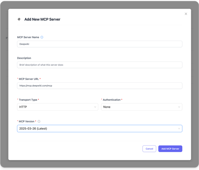 On this form, you should enter your MCP Server URL and the transport you want to use.