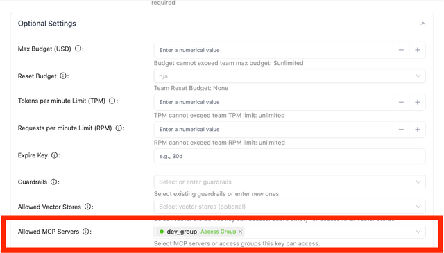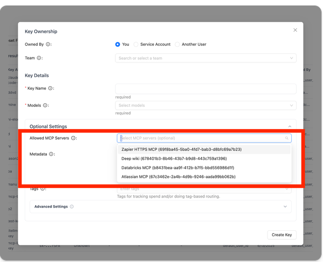 When Creating a Key, Team, or Organization, you can select the allowed MCP Servers that the entity has access to.